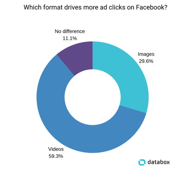 The trick is to make compelling video content — a video that might explain your product in an interesting way, garner an empathetic reaction, or elevate your brand using impeccable cinematic language. You don’t need famous Hollywood talent like Spike Jonez to direct your spots (although, that couldn’t hurt). No matter your budget, video content is superior compared to static images and text when it concerns clicks and engagement. Databox asked marketers about the performance of Facebook Ads, pitting videos against images.