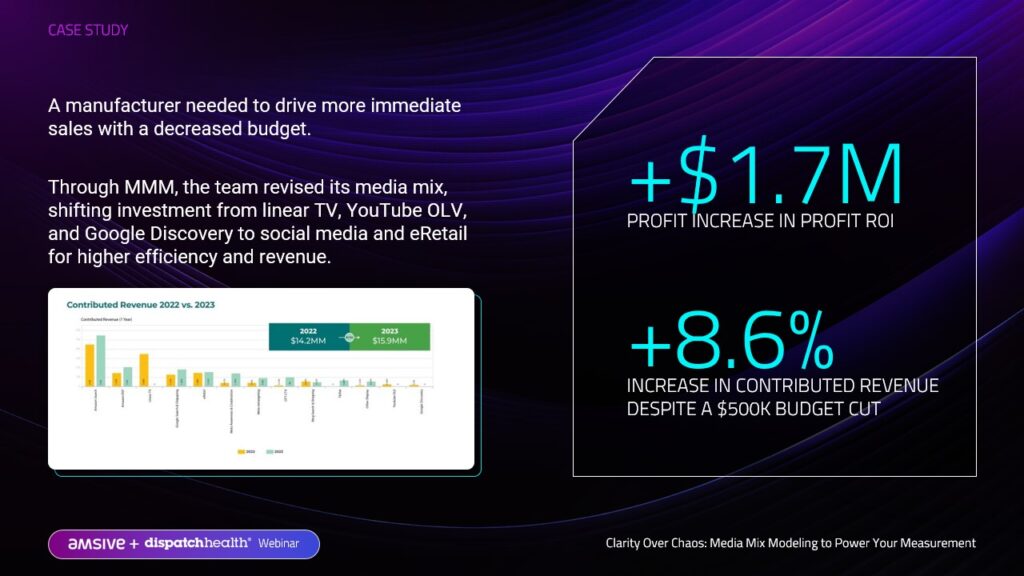 A case study demonstrated how a manufacturer used MMM insights to reallocate budgets from underperforming linear TV channels to higher-performing digital and CTV channels. This adjustment led to a $1.7 million revenue increase year-over-year, even with a reduced budget, showcasing the effectiveness of MMMs in optimizing marketing spend.