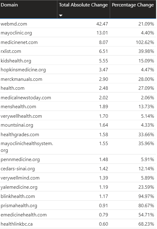 WebMD was by far the biggest winner in the health category, with a whopping increase of 42.47 visibility points, representing over 20% organic growth for the site.