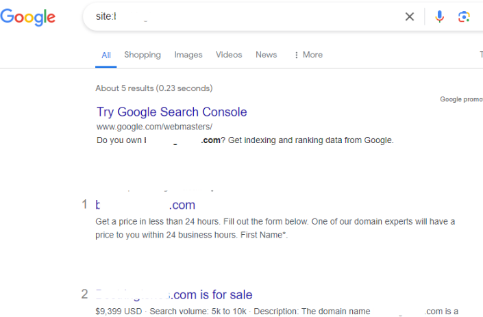 A more recent site search of the site in the image above reveals that it’s up for sale as shown in the below image. This is common for many sites that are significantly impacted by Google’s algorithm updates or removed via a manual action – it might not be worth the effort to maintain the site afterward.