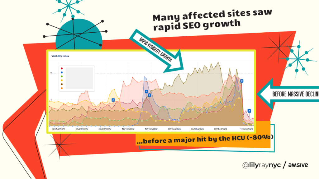 Below is a slide from Lily Ray’s presentation about the Helpful Content Update from the Digital Marketer Organization conference in Napa in October 2023, which shows how many sites experienced a rapid increase in SEO visibility before being hit by the September 2023 Helpful Content Update: