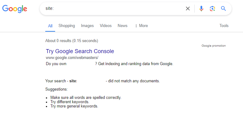 Among the sites we analyzed with the biggest ranking declines, many websites fell into the gaming category. In fact, several gaming websites appear to have received pure spam manual actions, which Google sent out as part of its spam update. For example, the gaming website in the screenshot below currently has no indexed pages on Google despite having received traffic and visibility up until March 8th (see the chart below).