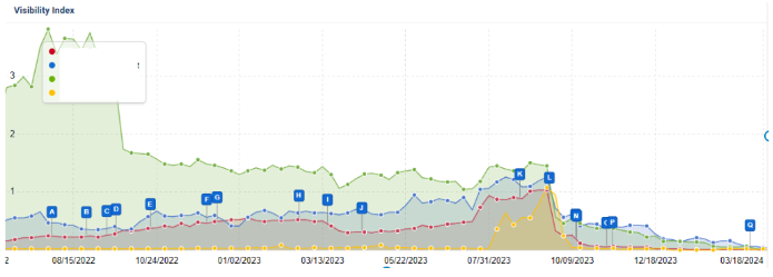 Looking at a few sites in this category, the chart below shows a uniform decline in visibility right after the September Helpful Content Update. This decline continued steadily, and after the March 2024 Updates, Indicated by the letter ‘Q’, visibility has gone down to zero or nearly zero for some sites.