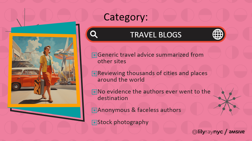 Unfortunately, this category seems to have caused significant collateral damage, as many legitimate travel bloggers who did indeed visit the destinations they reviewed also saw substantial traffic declines stemming from these updates. Time will tell whether Google makes adjustments to its ranking systems to ensure travel bloggers with real experience are able to receive more organic search traffic.