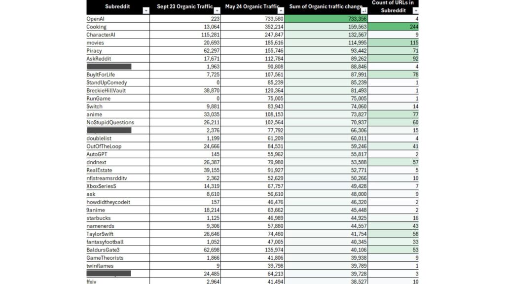 According to Ahrefs data, here are the subreddits that have gained the most traffic between September 2023 to May 2024, as seen in the image below: