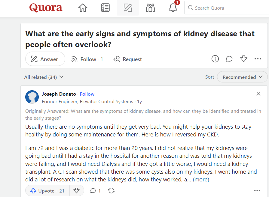We also sampled a few YMYL keywords in the medical niche and found helpful and unhelpful content. The keyword “signs of kidney problems” ranked eighth on Google. The user’s answer displayed at the top explained how they “reversed” their chronic kidney disease, as shown in the image below.