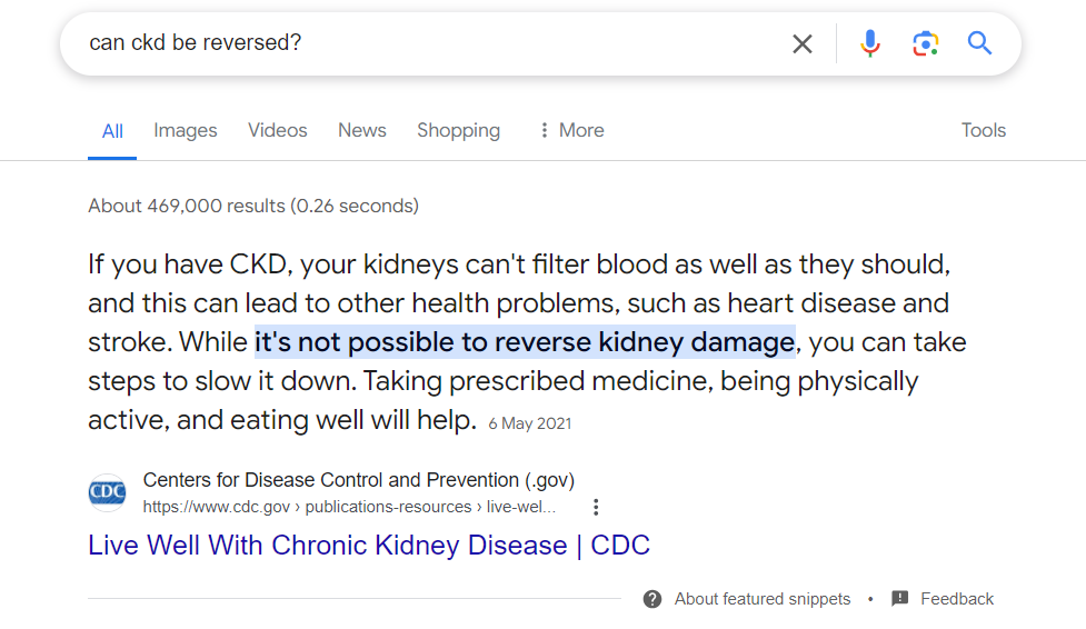 We then went ahead and looked up the topic on Google about reversing chronic kidney disease. We found an opposite answer that chronic kidney disease cannot be reversed but managed, as shown in the image below.