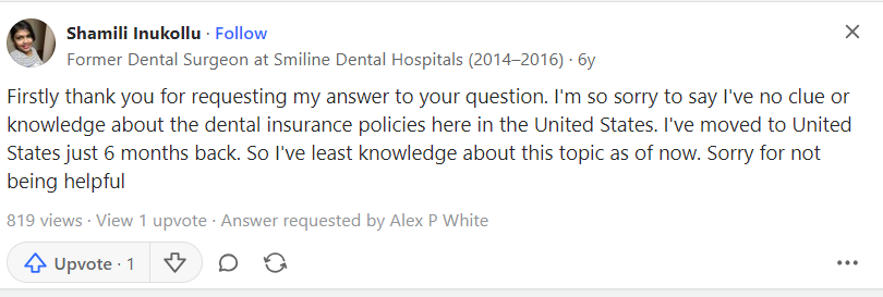 There was also an answer to the same question that stated, “I’m so sorry to say I’ve no clue or knowledge about the dental insurance policies,” which was actually not helpful at all (the respondent even says the answer is not helpful).