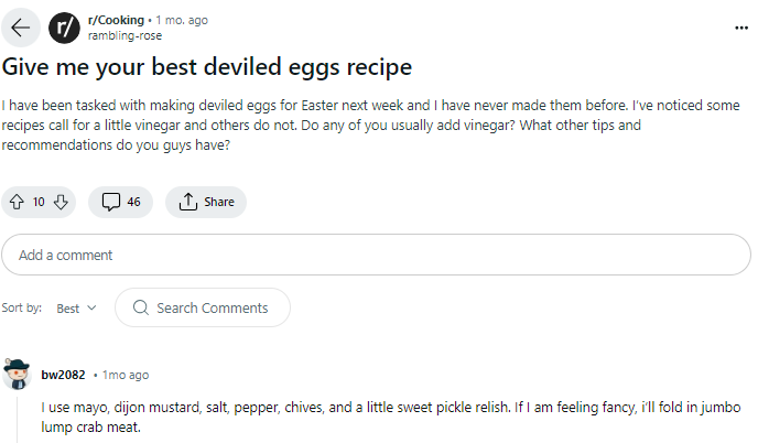 Despite this, the answer the user got for the query “Give me your best deviled eggs recipe” where they also asked “Do any of you usually add vinegar? What other tips and recommendations do you guys have?”, was not very helpful. While they received a list of ingredients, their question wasn’t fully answered and didn’t respond to her vinegar concerns.