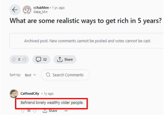 Another search query we looked at was “What are some realistic ways to get rich in 5 years?” for which Reddit ranked in position 4 in Google search results. However the answer provided, as shown in the image below, was a joke and not particularly helpful.