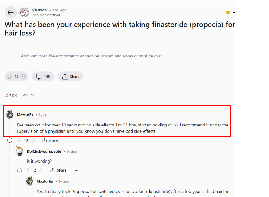 We also came across another YMYL keyword, “finasteride for hair loss,” for a user query, “What has been your experience with taking finasteride (Propecia) for hair loss?” This Reddit result, ranking number three, contains a top-rated answer stating that the user did not experience side effects from the drug finasteride.