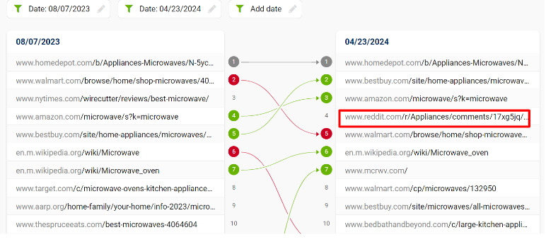 We analyzed ranking changes from July 2023 to April 2024. During this time, Reddit saw a surge of new keywords appearing in top rankings for various types of searches, including eCommerce queries. For instance, after analyzing the search results, we found Reddit newly ranking for the keyword ‘microwave’ in the fourth position, unexpectedly competing with established brands like Home Depot, Best Buy, Amazon, and Home Depot. It even outranked Walmart, Bed Bath and Beyond, and Wikipedia.