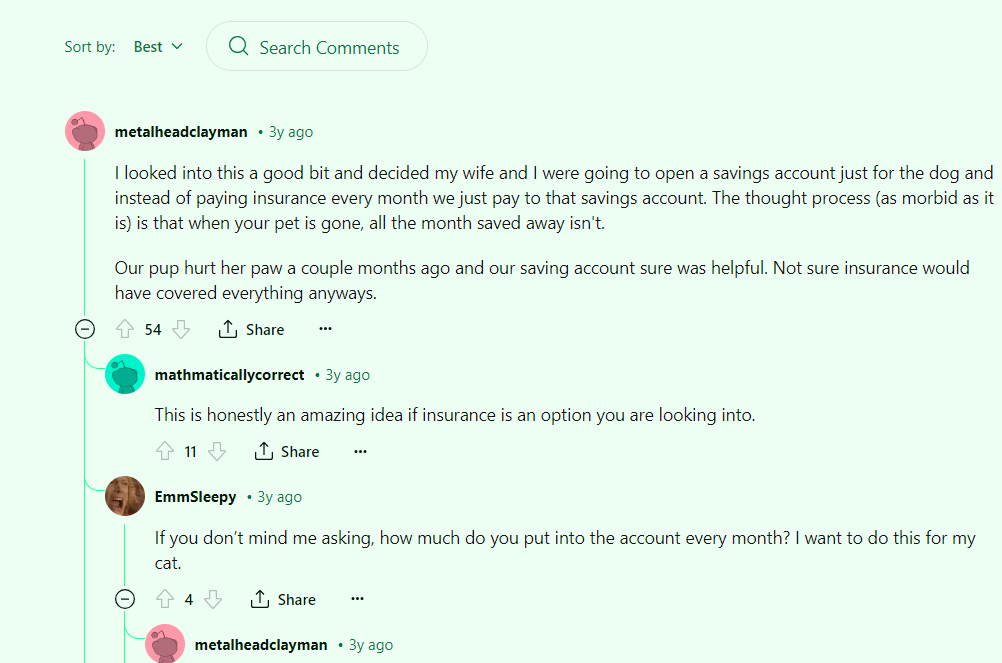 We also sampled a few finance YMYL keywords where Reddit is ranking in top positions. One of the keywords we looked at was “affordable pet insurance,” for which Reddit ranked in position 9. One of the top-most answers provided an interesting viewpoint: the user is seen advising people to ditch pet insurance and instead open a savings account, as shown in the image below.