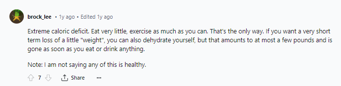 We found a YMYL (your money, your life) keyword, “how to lose weight quickly,” where Reddit ranks #9 on Google, answering a user question: “What are some good options to [lose] weight fast?” One of the top commenters suggested “cutting your arm off,” which is obviously a joke but could be dangerous for searchers.