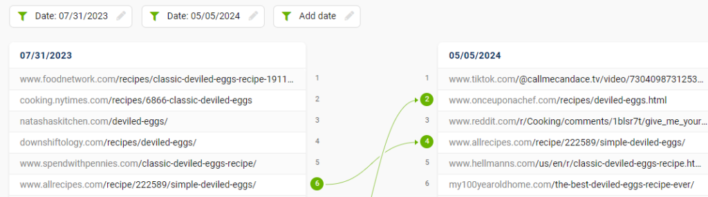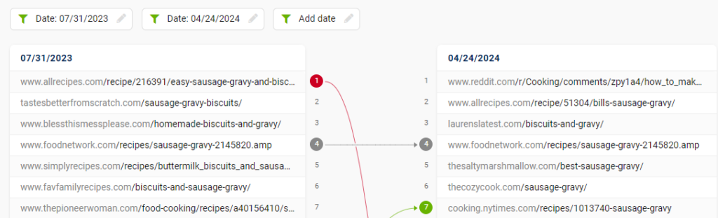 We looked at the keyword “biscuits and gravy recipe” between late July 2023 and mid-April 2024, for which Reddit now ranks in position 1 in Google search results. It was interesting to see that they ranked for this keyword, beating recipe sites like allrecipes.com, laurenslatest.com, and the Food Network.