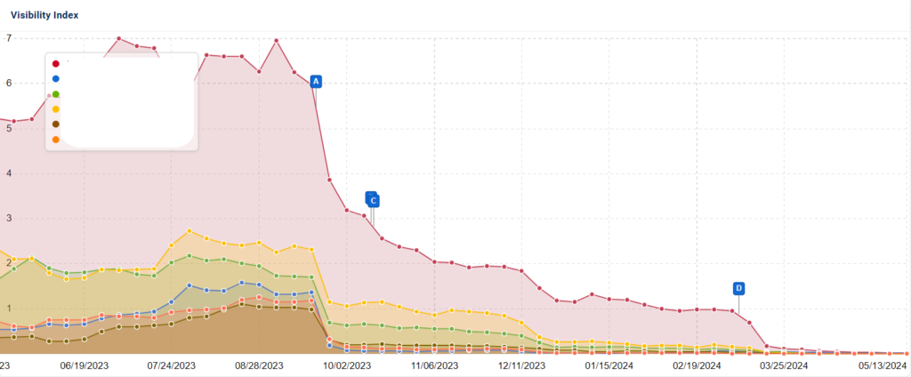 The above chart shows six sites heavily impacted by the September Helpful Content Update, shown with the letter ‘A.’ The March Core Update marked ‘D’ in the chart shows a further decline in visibility during the March 2024 updates, with some affected sites’ visibility approaching zero while others were even de-indexed via manual actions as part of the Spam Update.