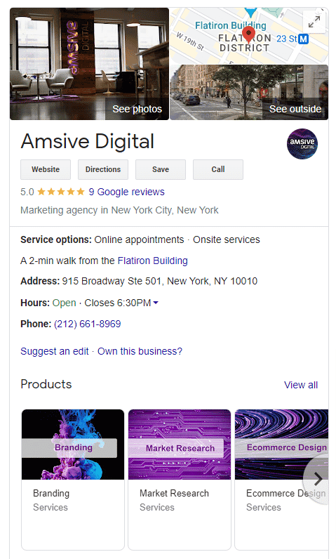 Google’s Knowledge Panel, seen below, is affected by verifying and optimizing your business information. The lack of verification means your business may not show up in key results. If your GBP isn’t fully filled out and optimized, it may be missing information or sharing inaccurate information entirely about your business location.