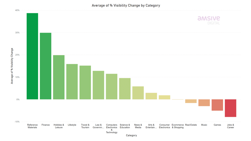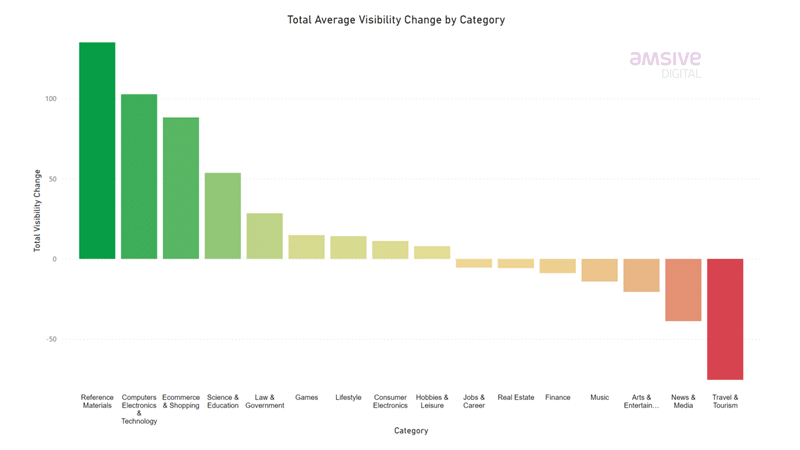 Below is the average percentage visibility change by category, which shows how much a category’s visibility has changed relative to its category’s own performance before the update rolled out. The chart has been filtered to display the categories with the greatest positive or negative change.