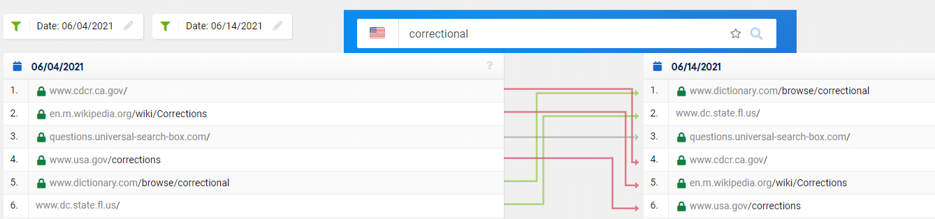 Below is an example of what these changes look like on the query-level for the query “correctional.” The California Department of Corrections and Rehabilitation was replaced by dictionary.com for the #1 ranking position, perhaps because Google determined that defining “correctional” is the main intent of most searchers above looking up that correctional facility.