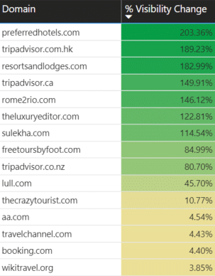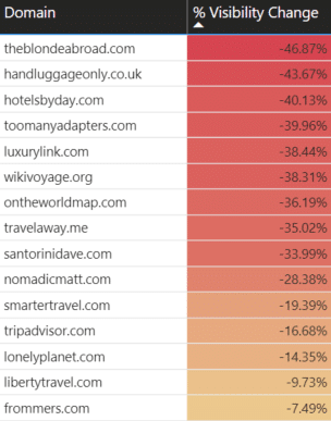 The bulk of the decline in overall visibility to the travel category stems from declines seen by TripAdvisor, which lost a whopping 75.59 visibility points since the update was launched.