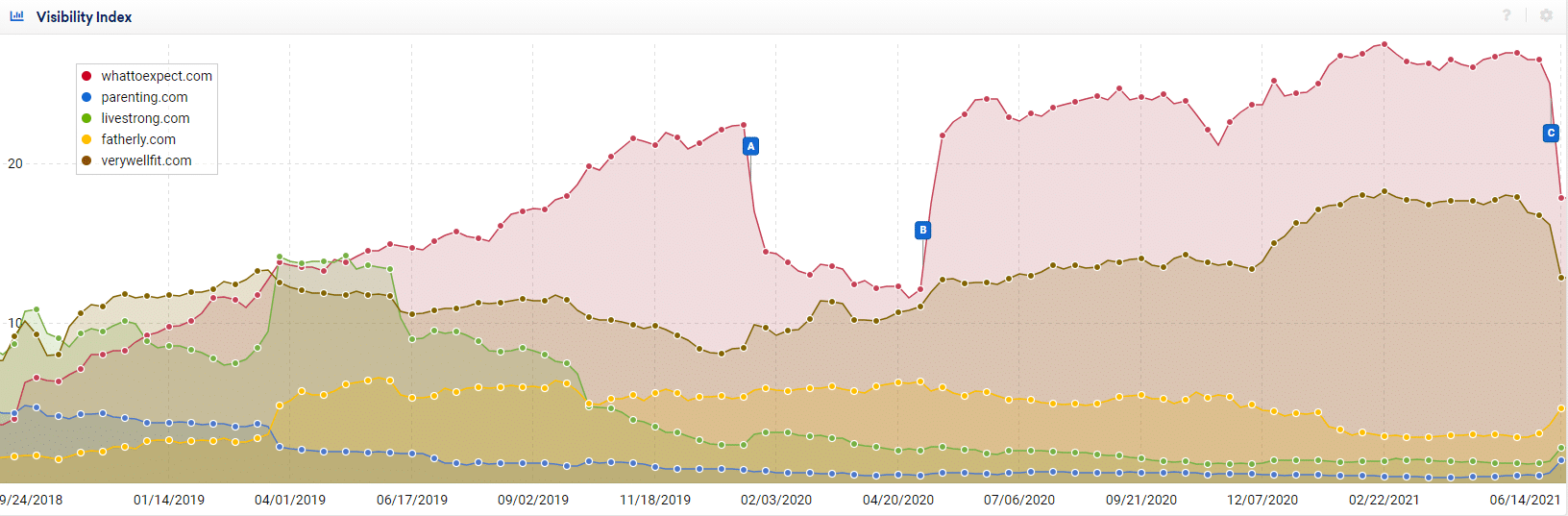 There was significant movement among some sites in the health, wellness, and parenting categories (which fall into the YMYL – your money, your life category). In some cases, the June 2021 Core Update resulted in massive reversals in visibility trends seen by prior core updates and during the past several months. For example, What To Expect and Very Well Fit saw an enormous drops in visibility, while Livestrong, Fatherly, and Parenting all saw increases.