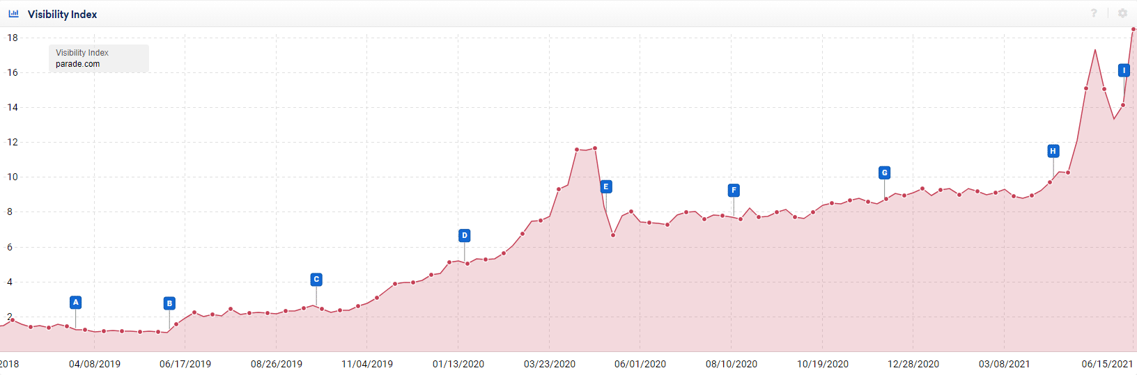 The publisher “Parade” is seeing big increases as a result of the core update, but these extreme increases actually started a few weeks earlier, with Google’s Product Review update (letter H in the below graph). The site has gained top rankings for a wide variety of keywords related to “jokes,” “pick up lines,” “fun facts,” and “quotes,” beating out some lesser-known sites.