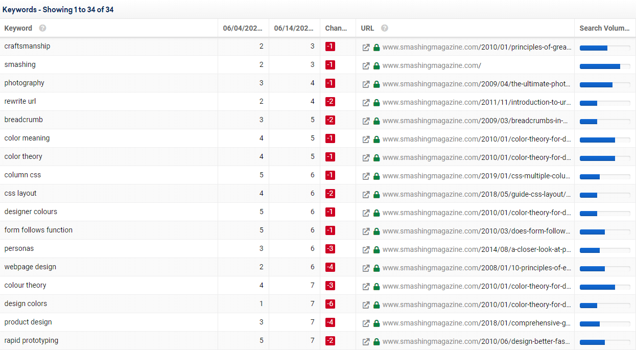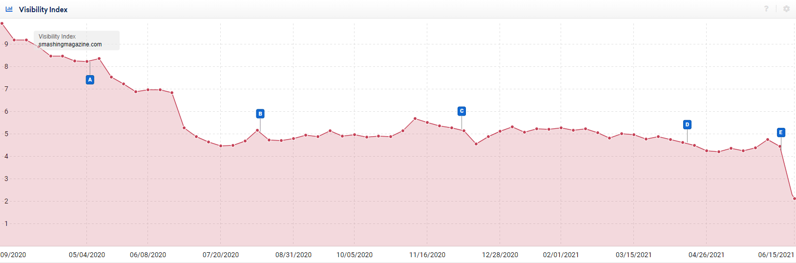 The decline seems extreme, but is actually due to very high-volume queries moving down by just a few ranking positions, including its (ambiguous) brand name “Smashing,” which now generates dictionary results, a YouTube video, and a Knowledge Panel about the Smashing Pumpkins.