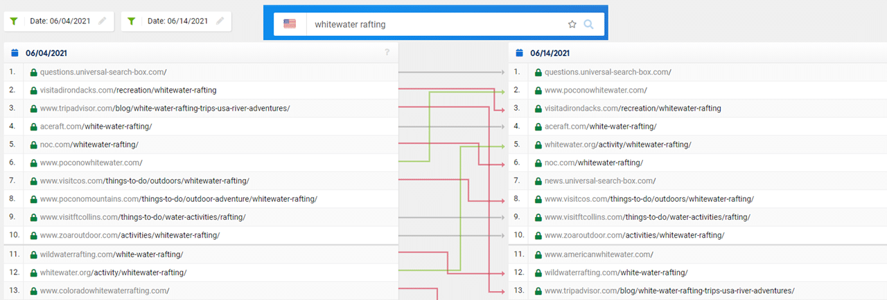 Looking closely at keyword movement, it appears that Tripadvisor saw some declines for keywords where an official travel destination website took its place, such as the below example for the query “whitewater rafting” where Tripadvisor was pushed from position 3 to page 2.