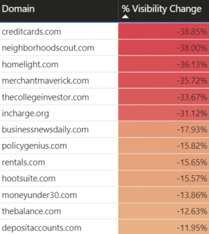 This update appears to have had a significant impact on many business and finance websites. Below are the greatest winners in Finance + Business, sorted by % change.