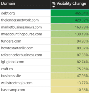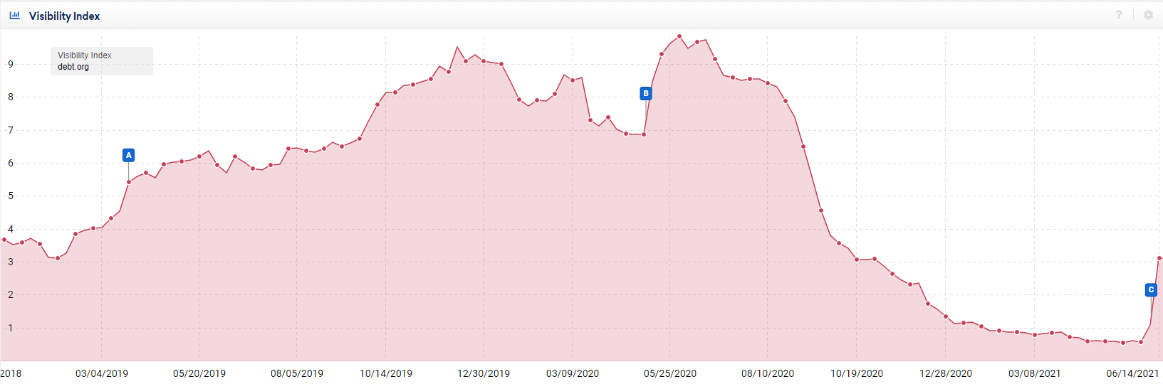 The significant increase for the domain debt.org is especially interesting, given the massive declines in visibility it saw in late 2020. This is one of several sites seeing such a pattern, such as parenting.com, livestrong.com, and others.