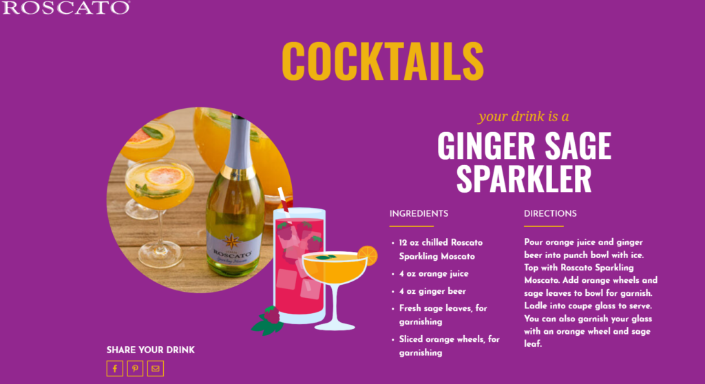 Roscato also has a Choose-Your-Own-Adventure-esque cocktail maker that invites users to select their mood, plans, and location’s vibe. The moods vary from bubbly to fierce. The assorted locations include ‘at home,’ ‘on the beach,’ and ‘under the stars,’ to name a few. By selecting different choices, Roscato recommends a custom cocktail for you to enjoy.