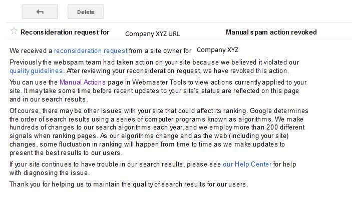 Once your request has been reconsidered, and Google decides that your site is not harmful and lifts the warning, you will receive a response like the above example.